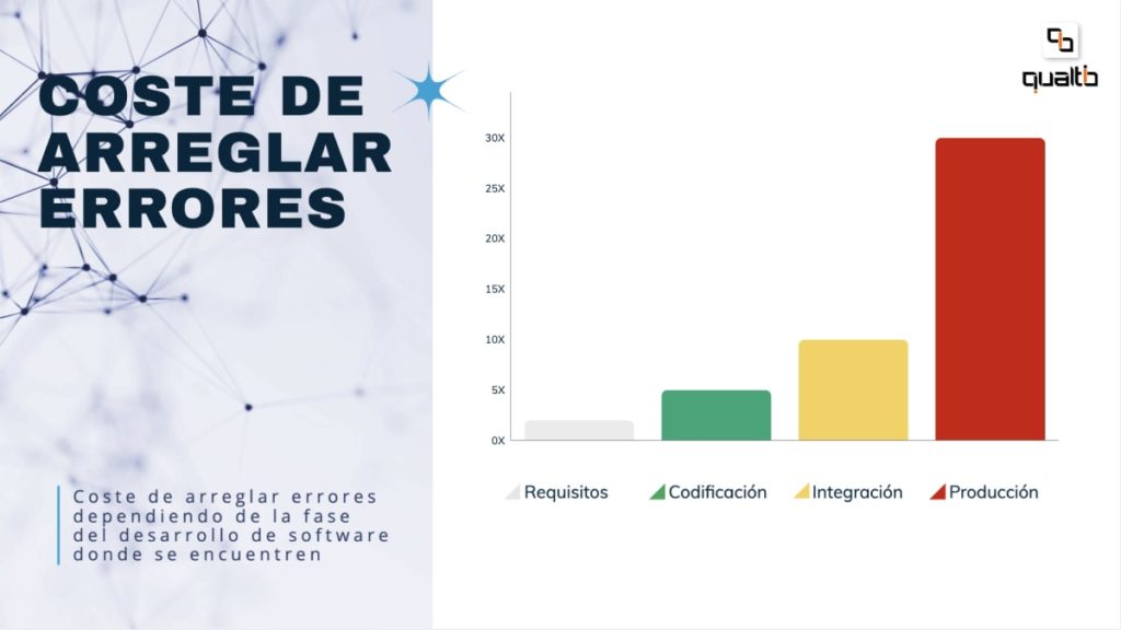 Y no solo hablamos de algo sencillo y rápido, sino también mucho más barato: hablando en términos económicos, el coste de detectar y corregir los errores es más bajo cuanto más temprana es la fase de desarrollo donde se detectan.